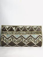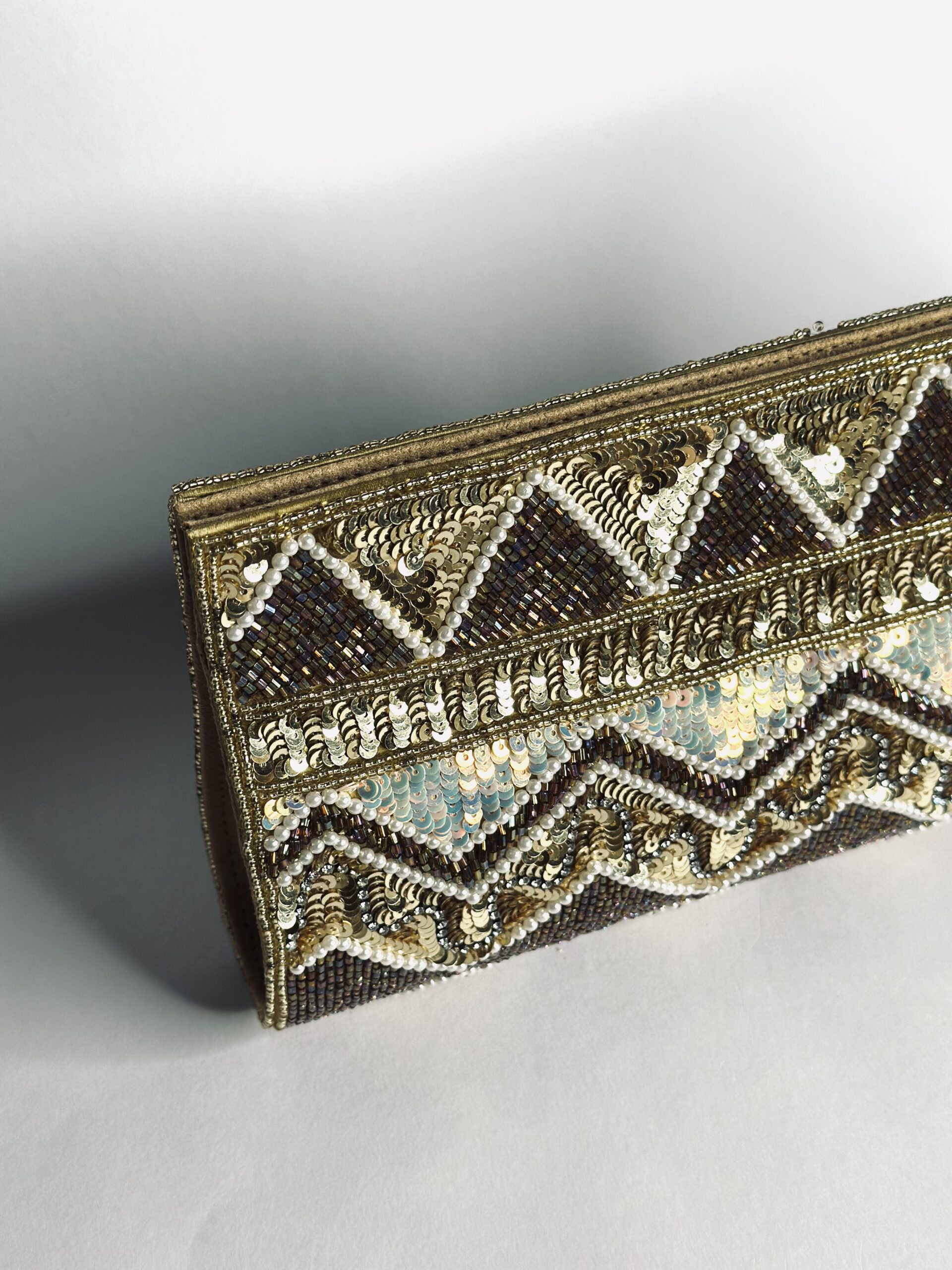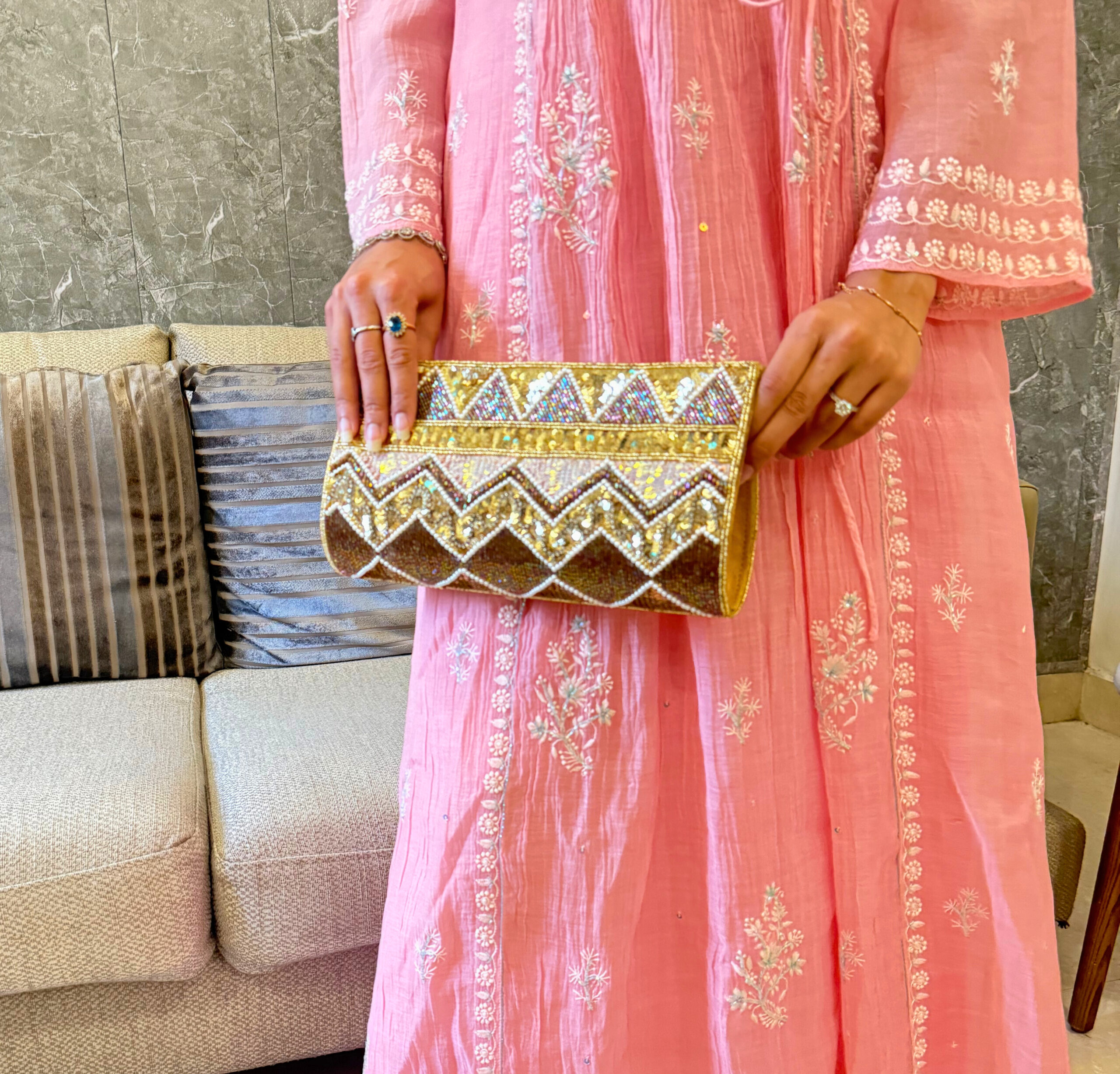 The Aurafold is your go-to clutch when elegance meets understated opulence. This envelope-style handbag showcases delicate chevron beadwork in shimmering tones of champagne, rose gold, and ivory, outlined with metallic threadwork for that added sparkle. It’s a graceful blend of modern sophistication and timeless festive charm — perfect for weddings, evening soirees, or even a luxe brunch look.