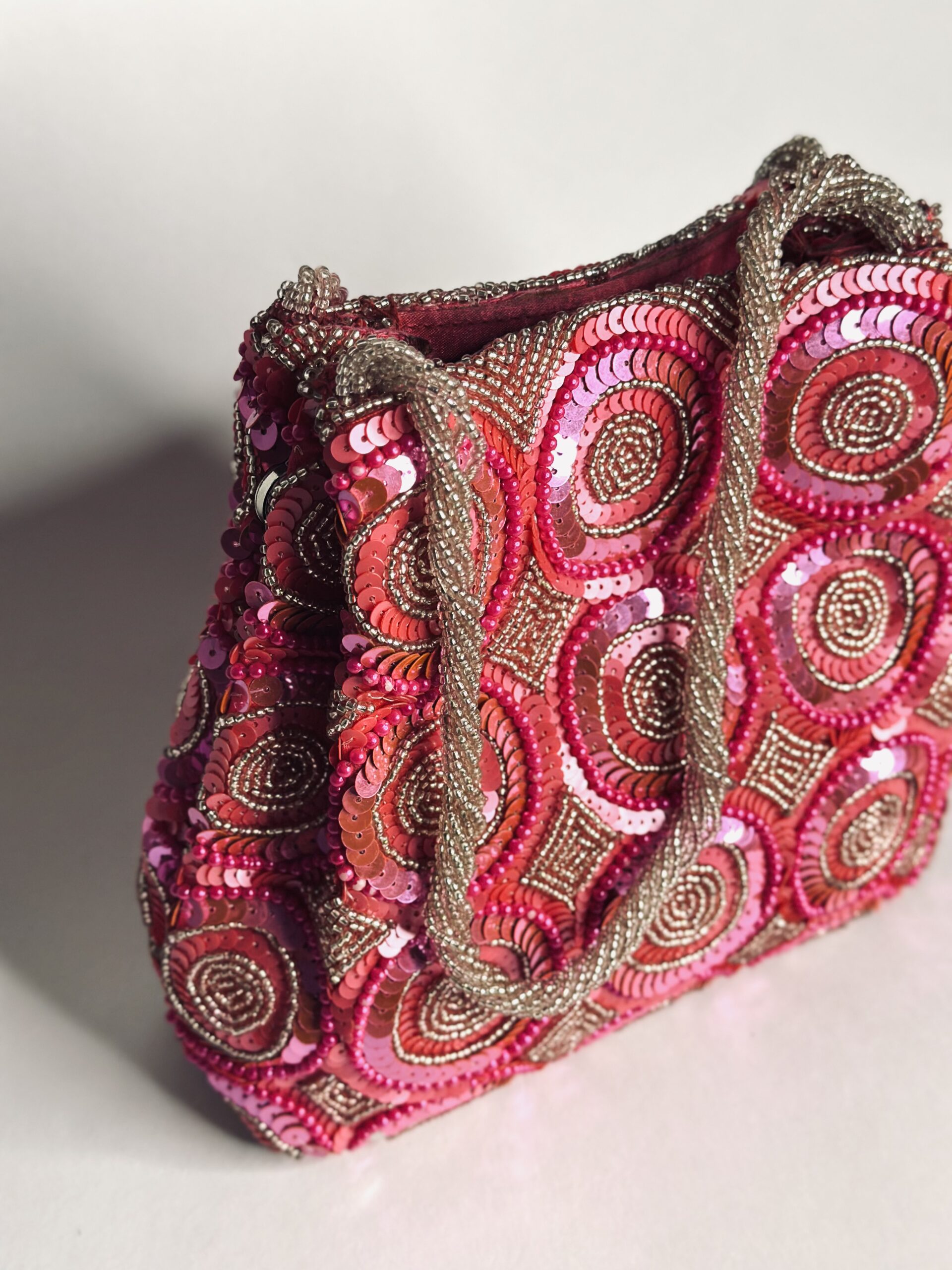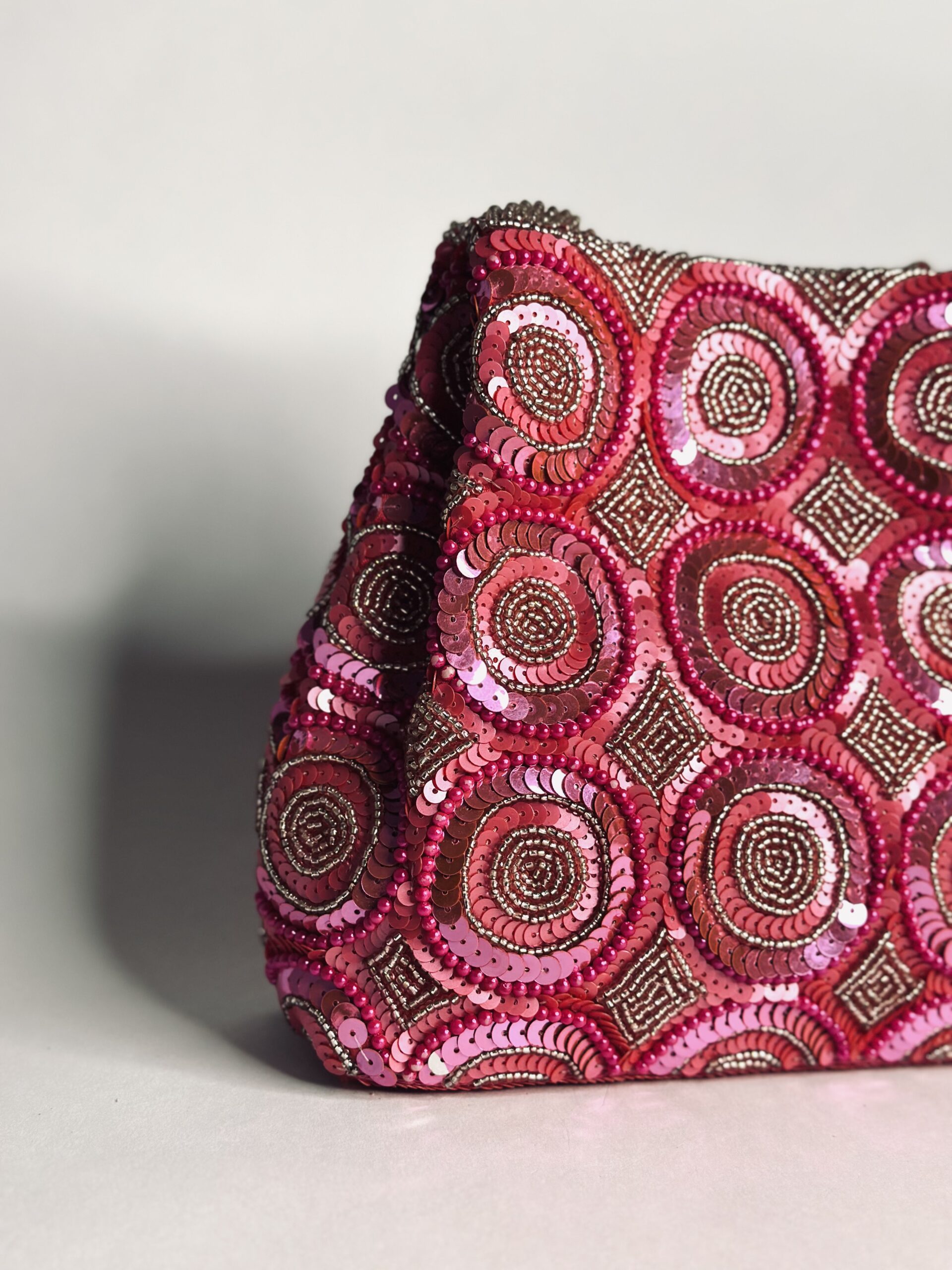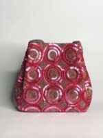 Bring the drama with Fuchsia Fiesta, a statement bucket bag that knows how to party. Hand-embroidered with dazzling glass beads and sequins in rich, fuchsia pink hues, this bag is made to turn heads. The circular and geometric motifs give it a playful, retro feel, while the intricate beading adds a touch of luxe craftsmanship.