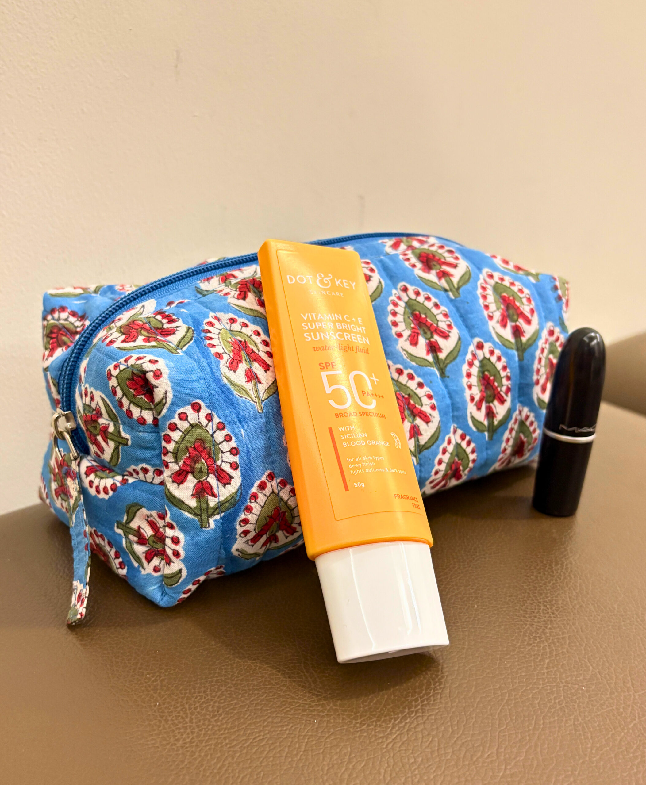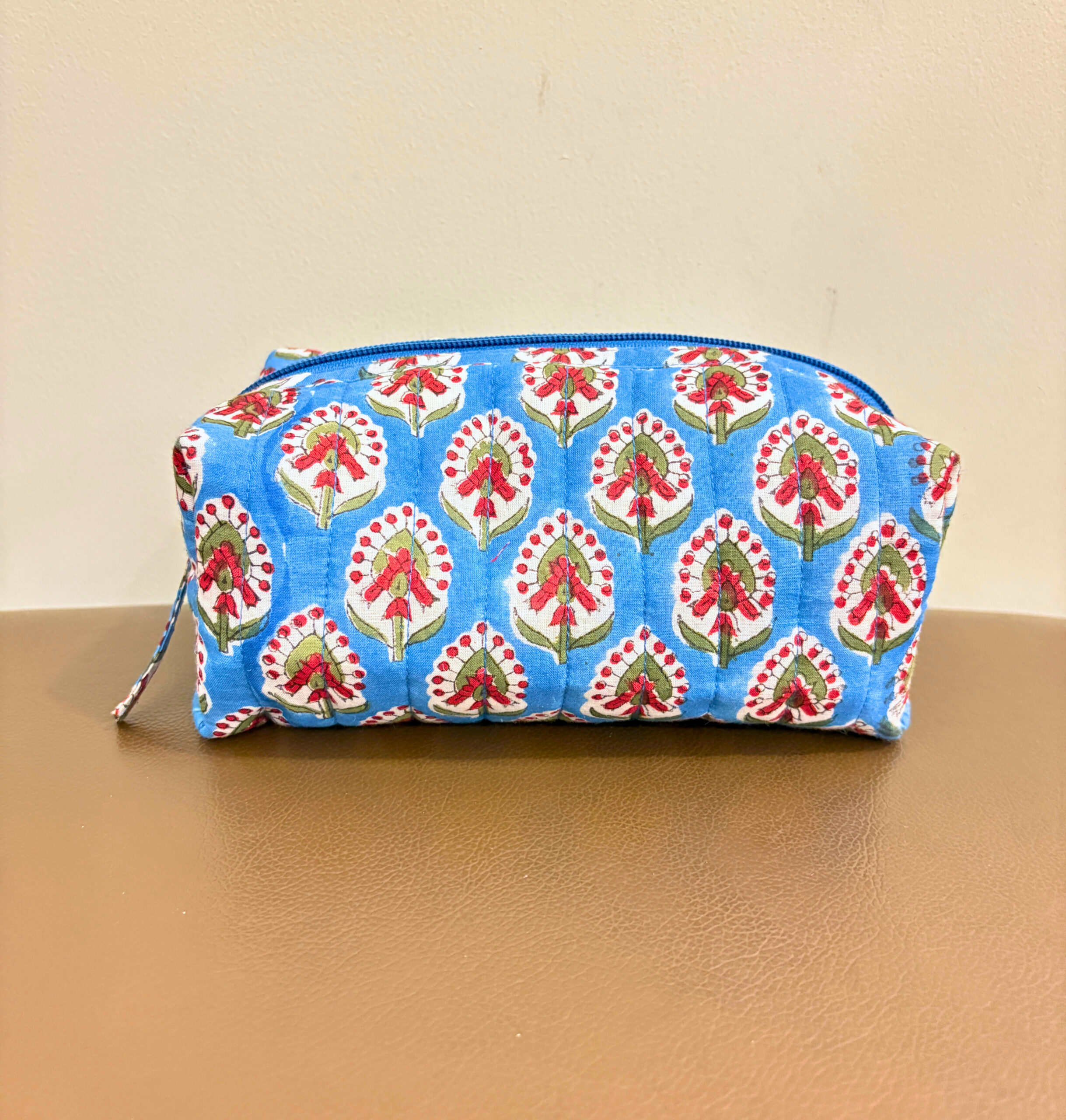 A pouch that’s as vibrant as your personality. Gul Gappa is designed to bring joy to your daily routine with its hand-block printed floral pattern. The eye-catching red and white floral motifs set against a calming sky-blue background make it the perfect companion for your everyday essentials. Whether you’re heading out for work or packing for a quick getaway, this pouch fits right into your handbag or suitcase. The structured yet soft quilted design adds a hint of luxury while being easy to carry.