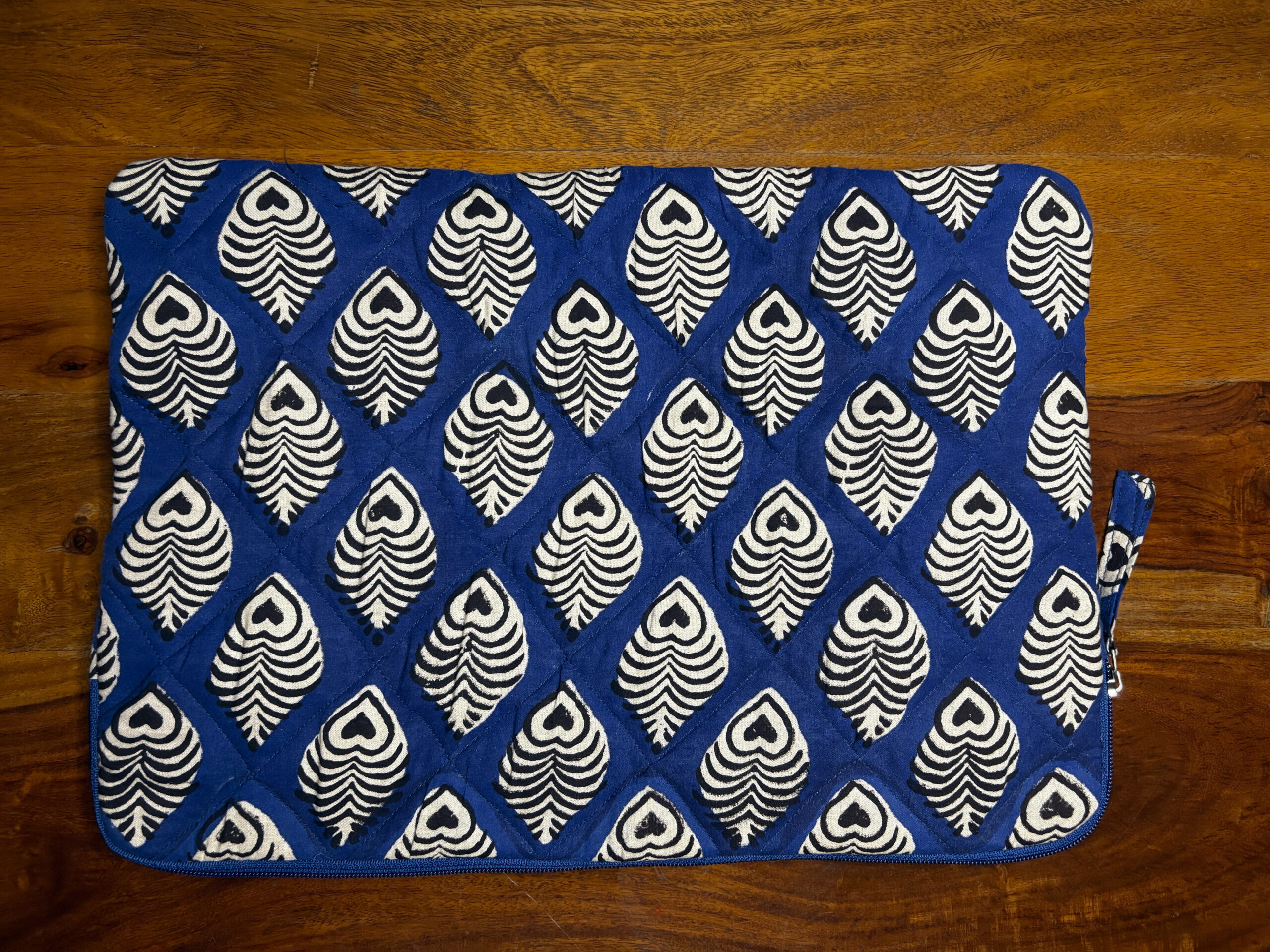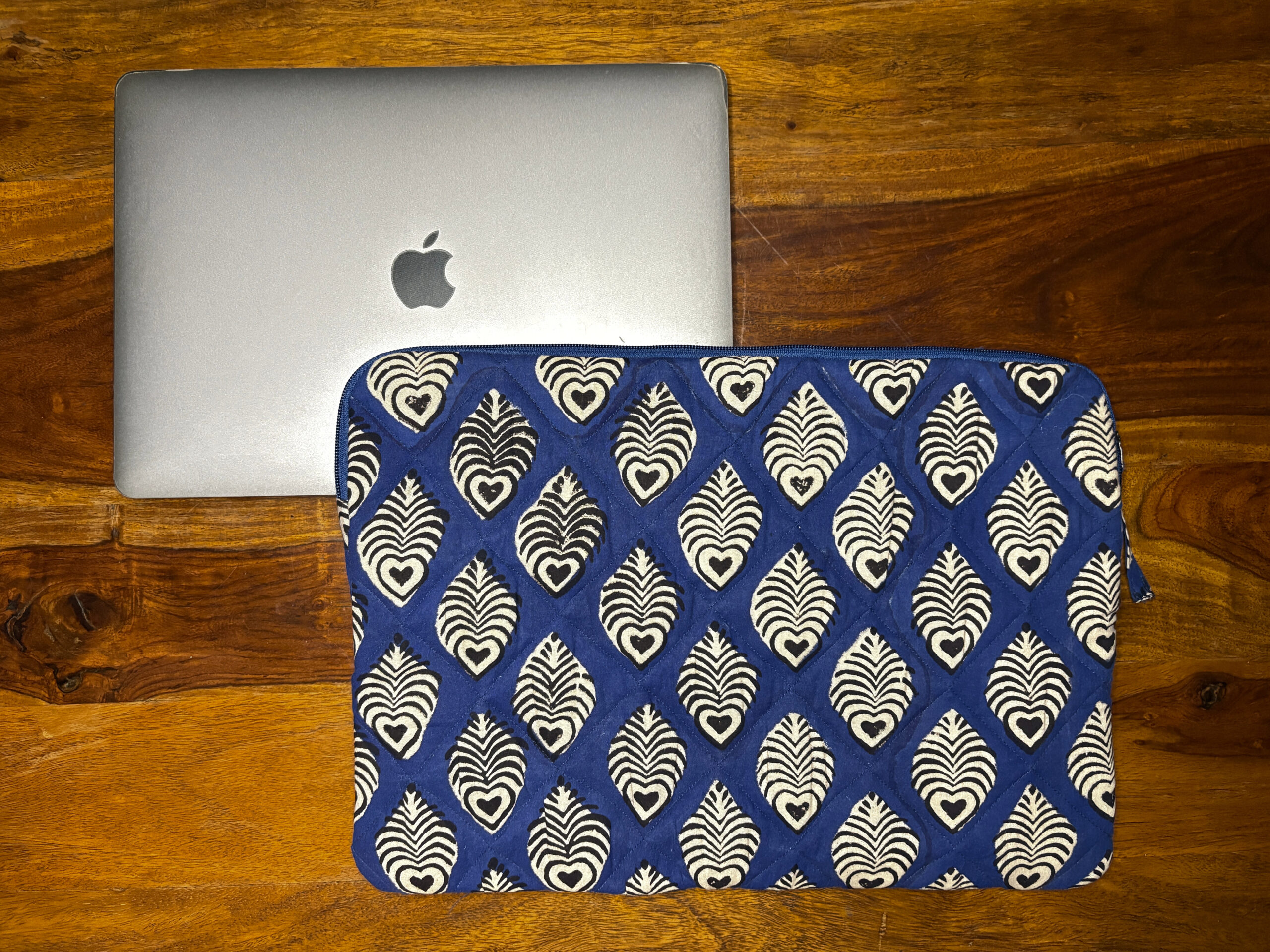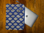 A chic and functional laptop sleeve featuring block-printed heart-leaf motifs that radiate subtle charm. The deep indigo hue contrasts beautifully with the symmetrical patterns, offering a bold yet elegant look. Crafted for everyday use, it provides reliable protection while making a statement. Perfect for those who blend tradition with tech.