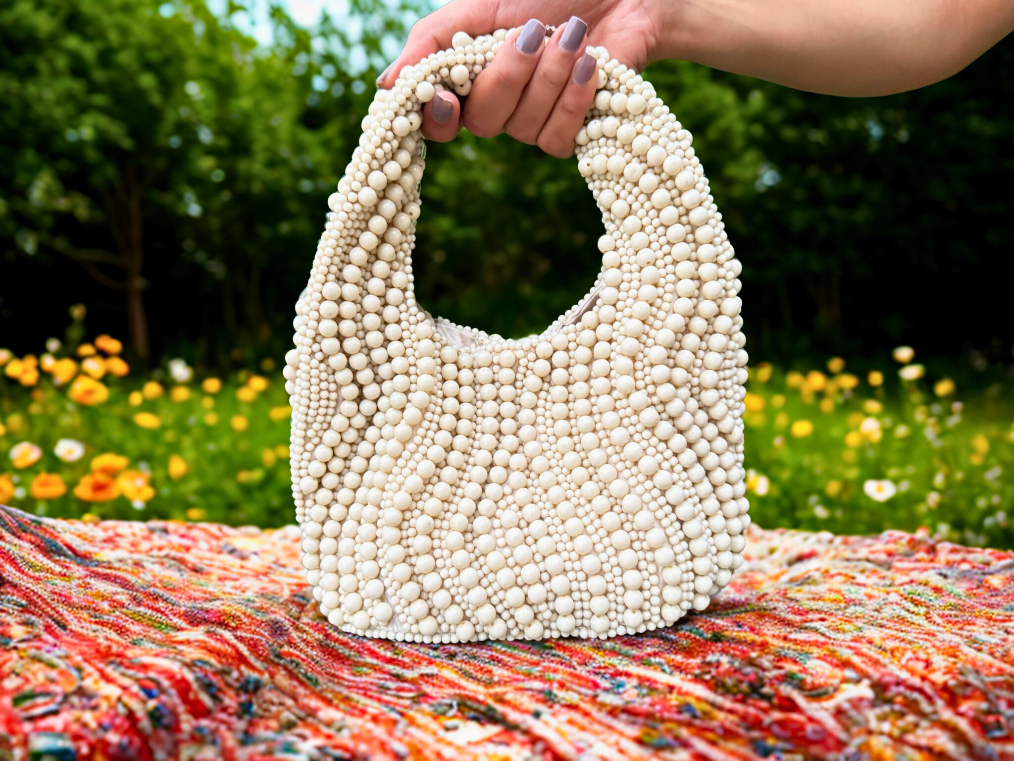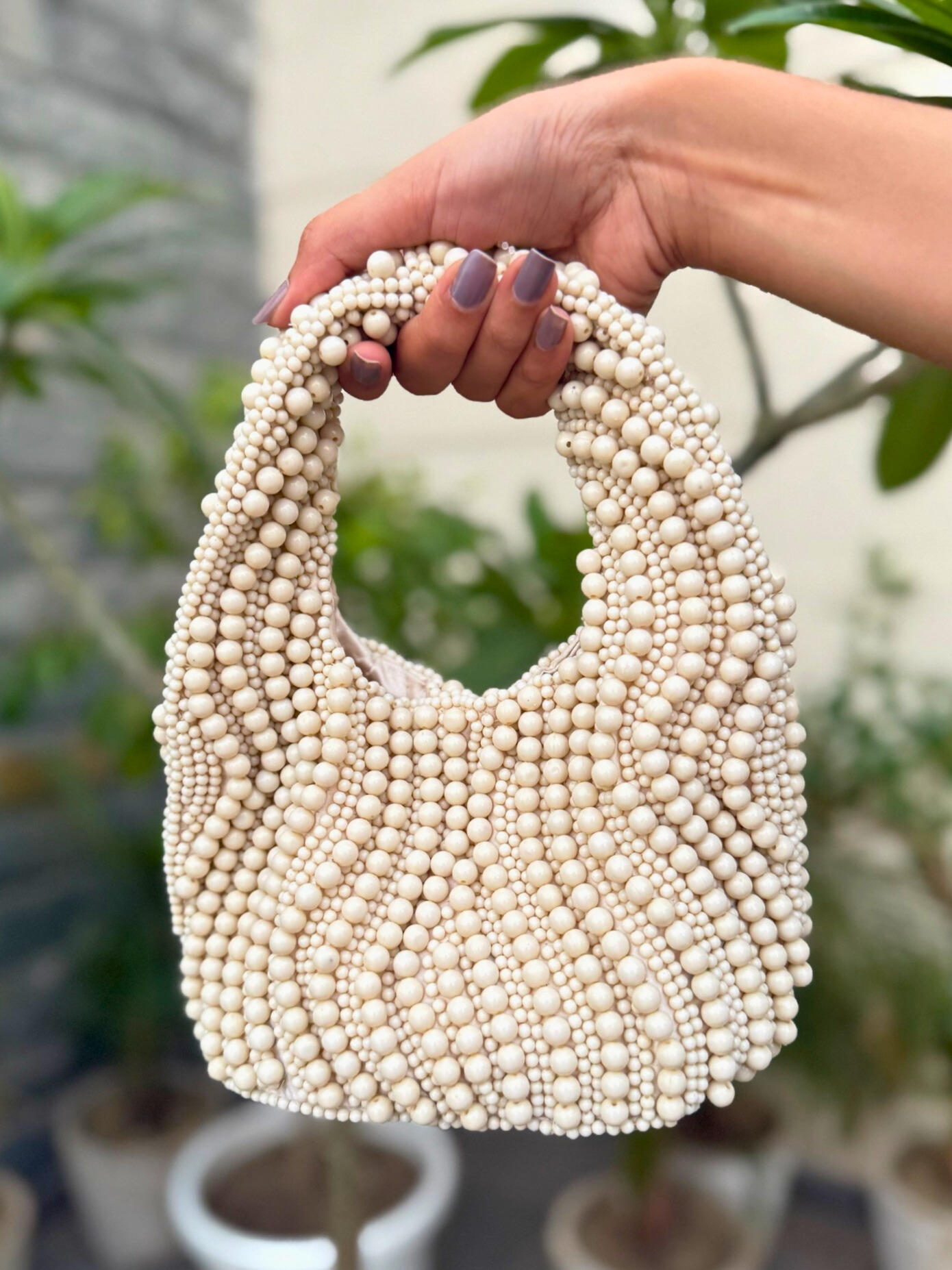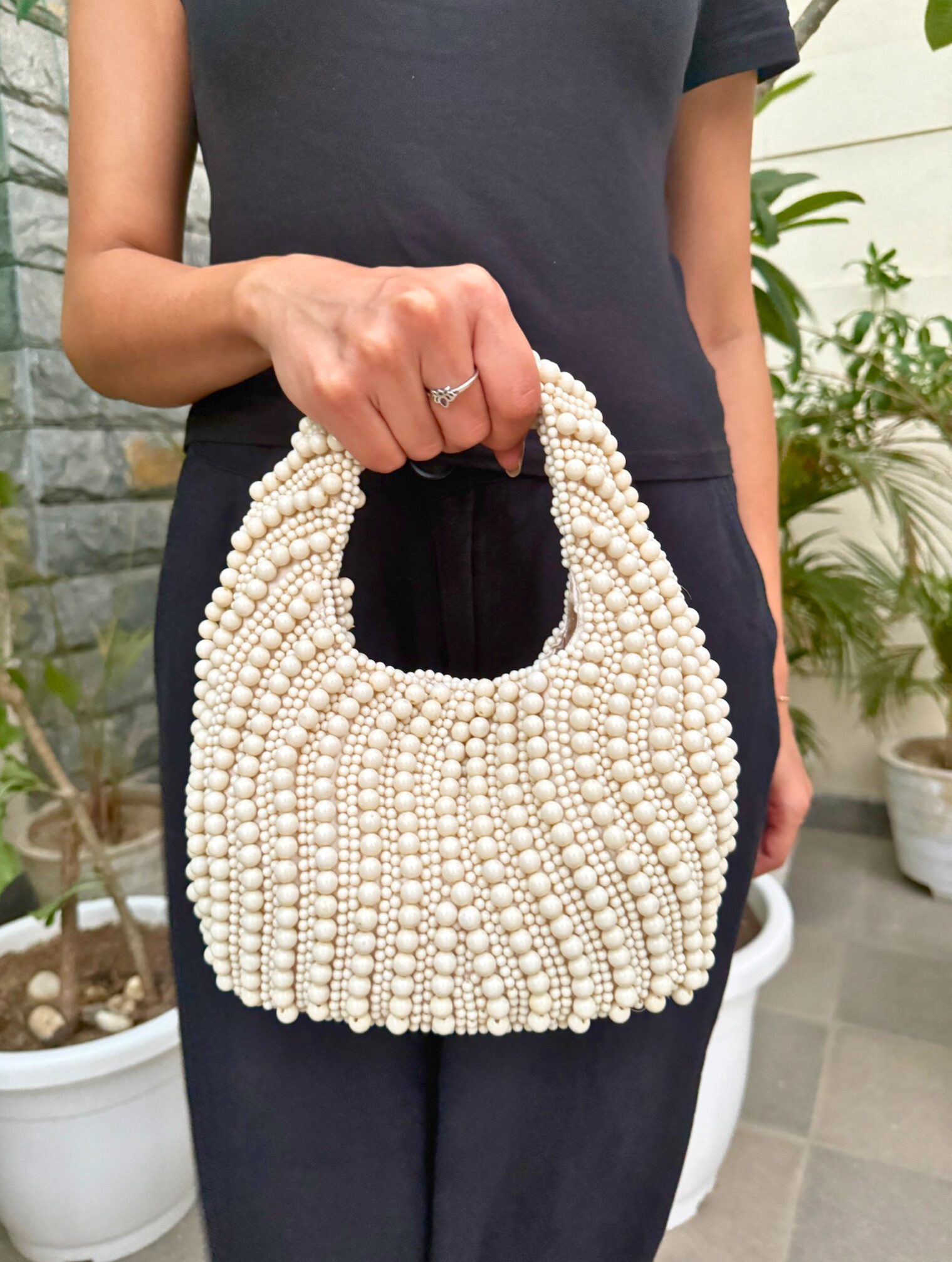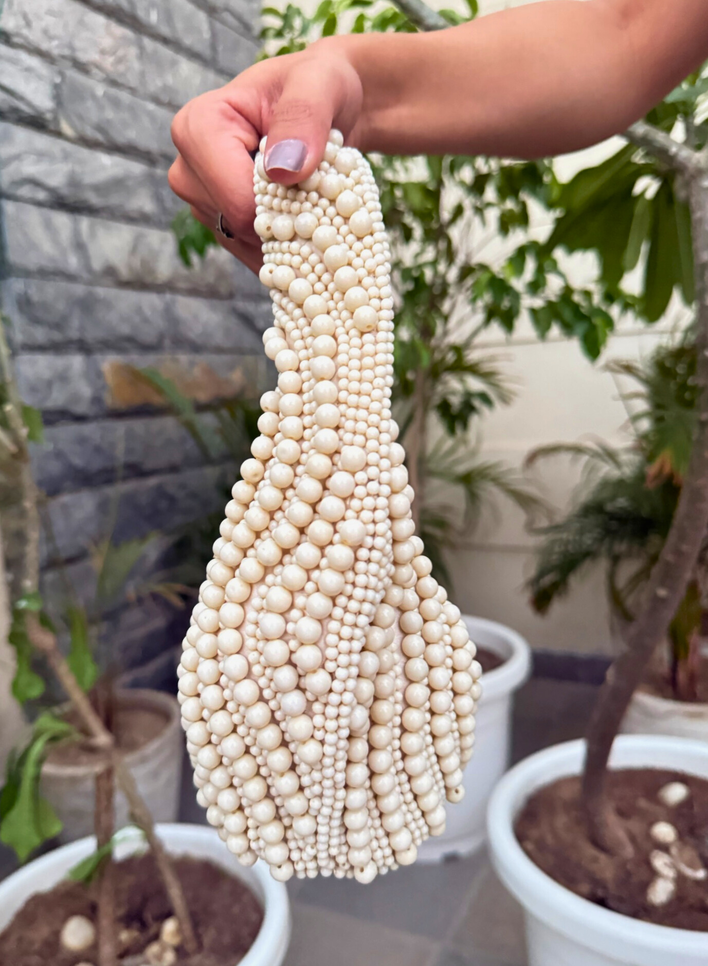 A vision of understated elegance, the Ivory Cascade is a sculptural mini-hobo bag adorned with a rhythmic flow of ivory-toned beads. Entirely hand-embroidered by skilled artisans, its textured surface mimics the graceful movement of water – organic, fluid, and timeless. This piece pairs effortlessly with both traditional ensembles and minimal Western outfits, making it a go-to for brunches, mehendi ceremonies, or evening soirees.
