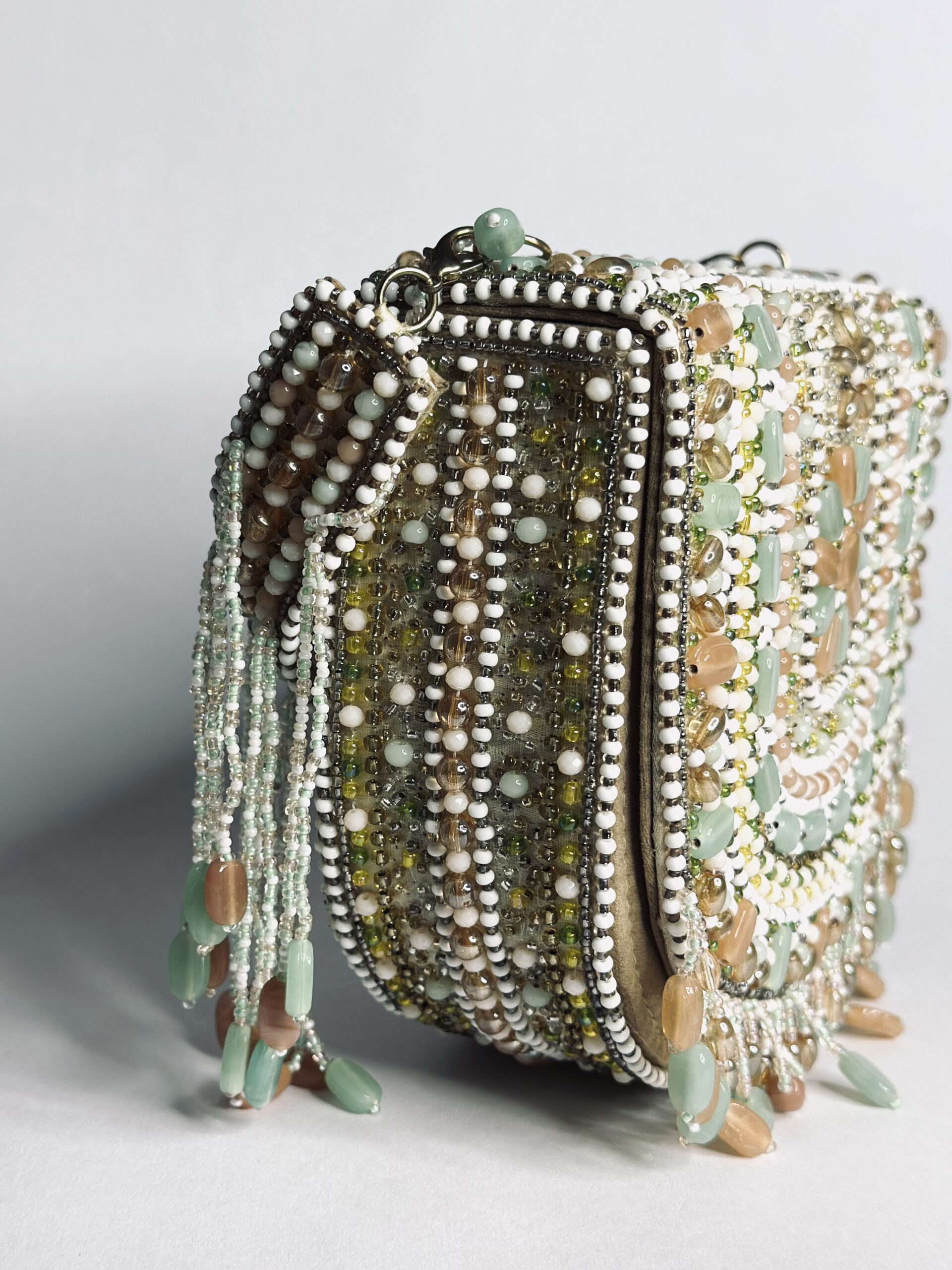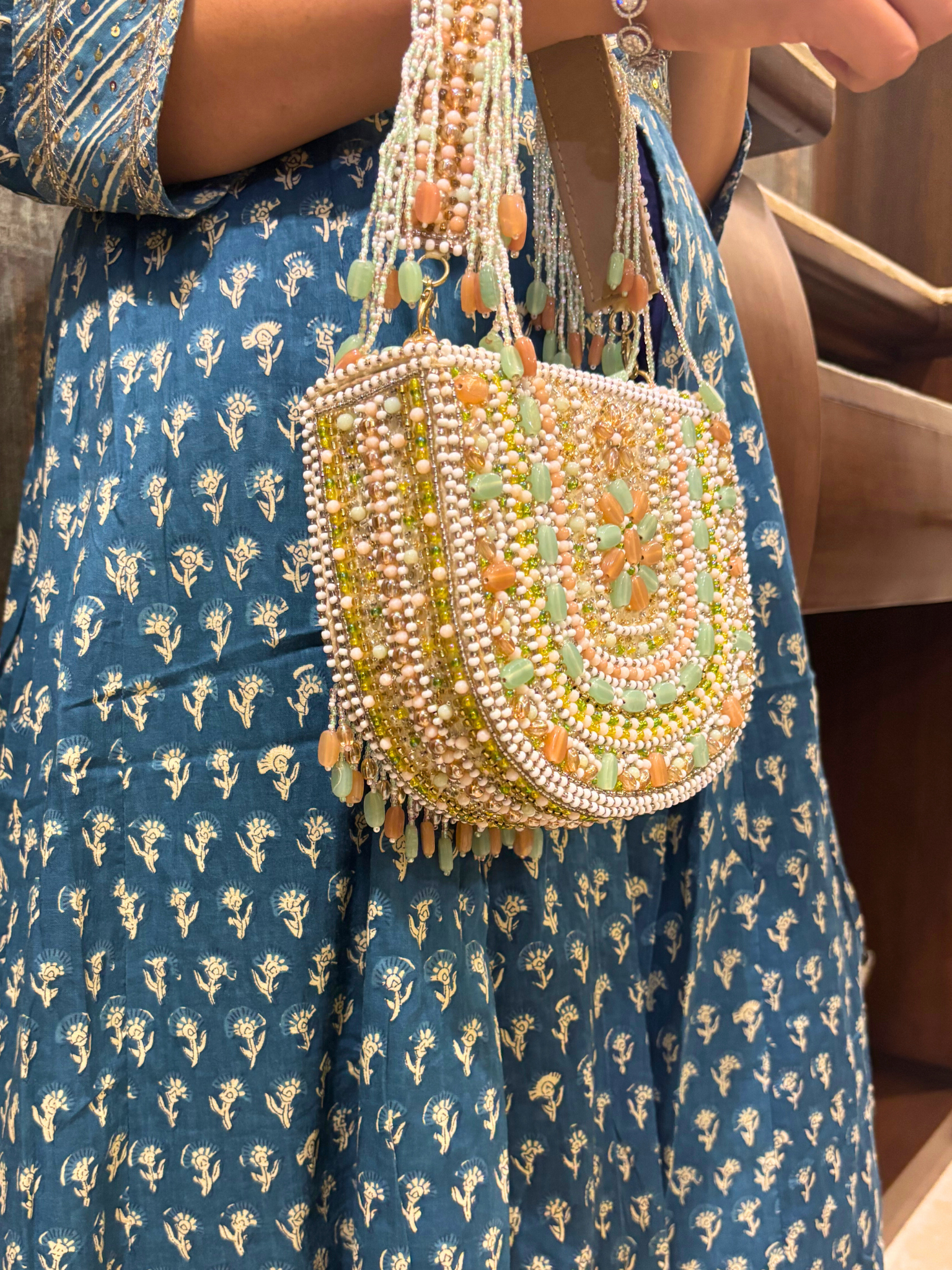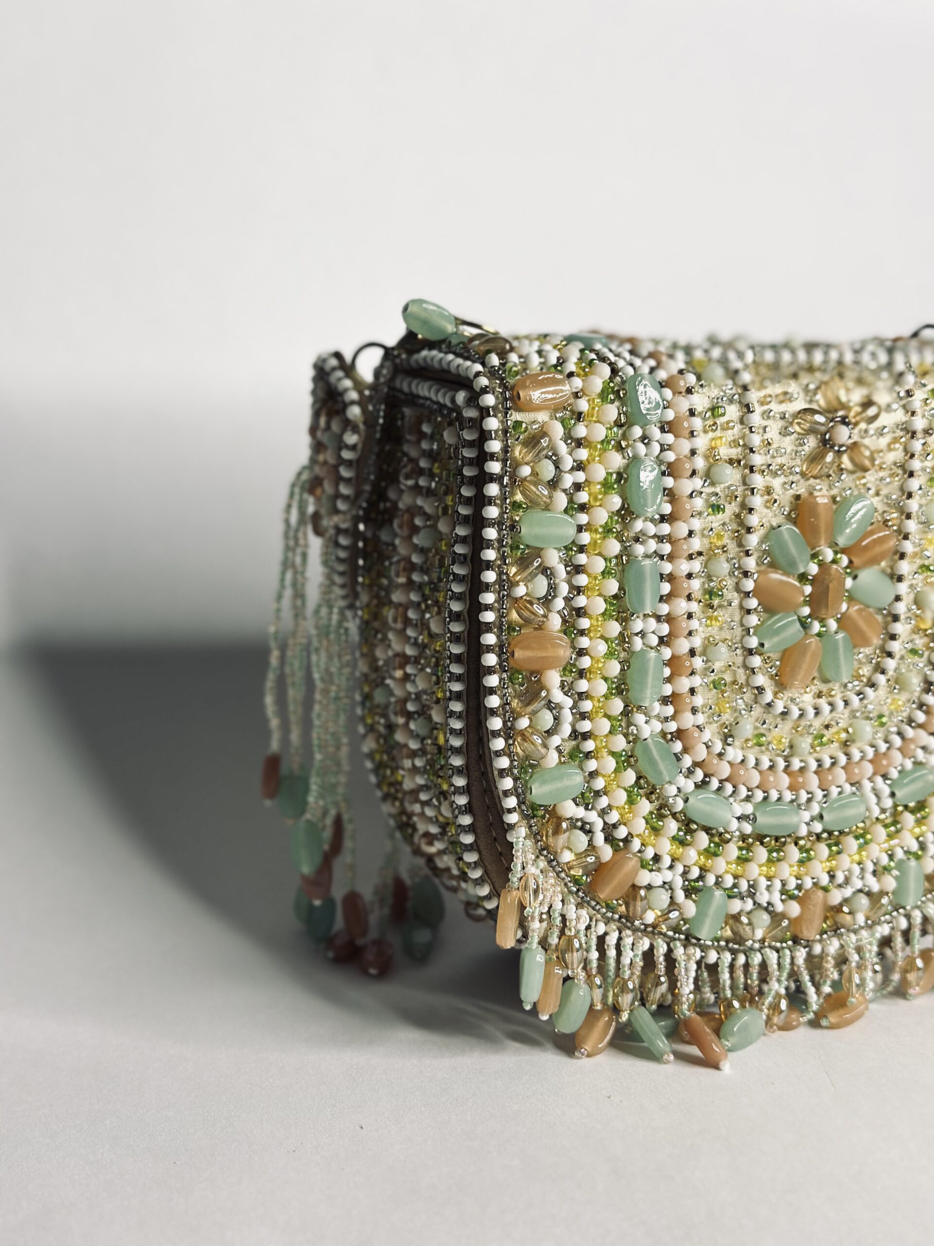 Noor Tara is a stunning handcrafted handbag that blends elegance with ethnic artistry. The semi-circular flap is adorned with an intricate floral medallion at its center, surrounded by symmetrical beaded motifs in radiant yellow and mint green. The base fabric has a subtle sheen that complements the warmth of amber tones and the cool tranquility of green accents. A cascading fringe of beads at the bottom adds a playful, eye-catching shimmer with every step. Whether paired with festive wear or a modern indo-western look, this bag promises to be a conversation starter.