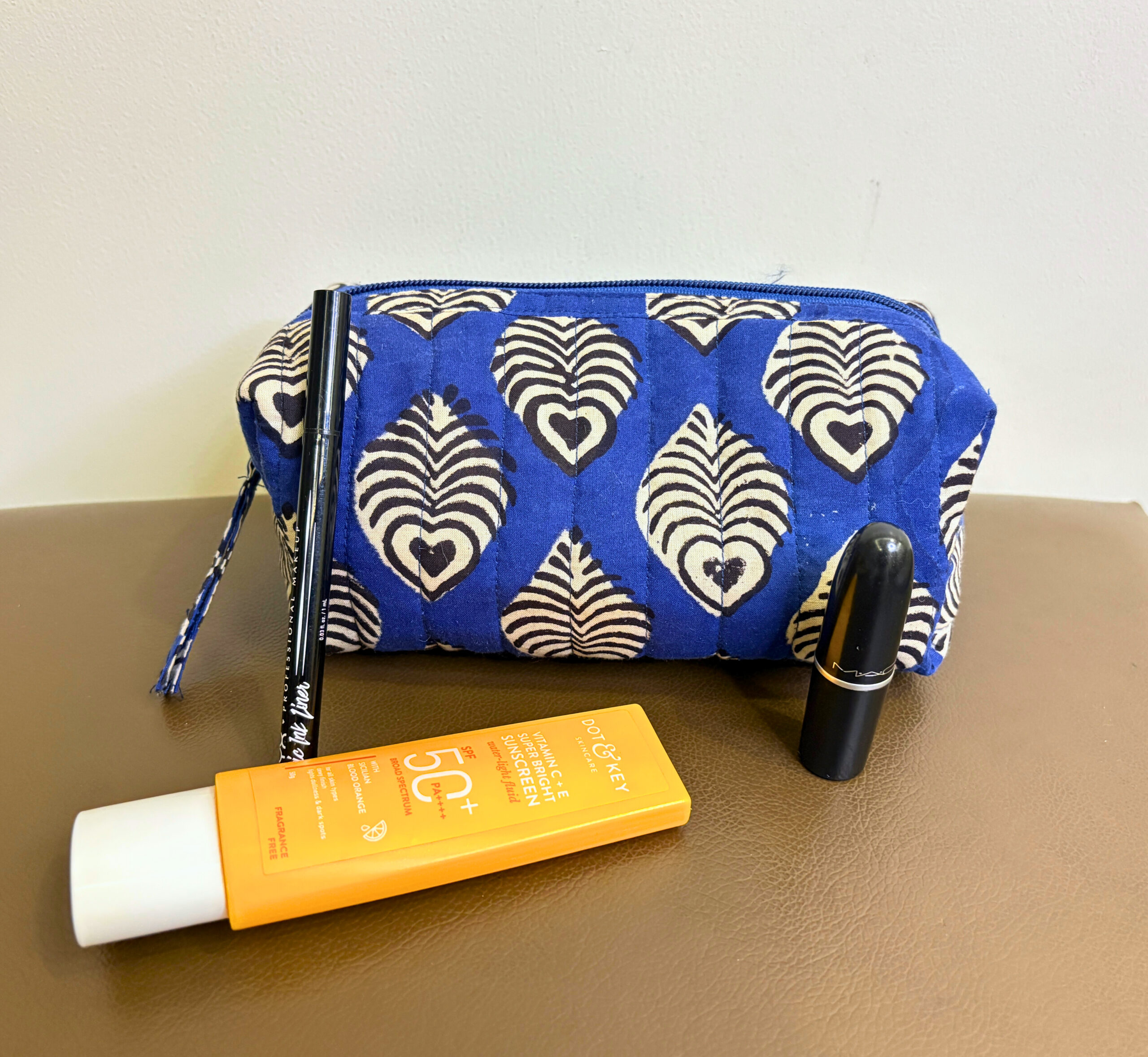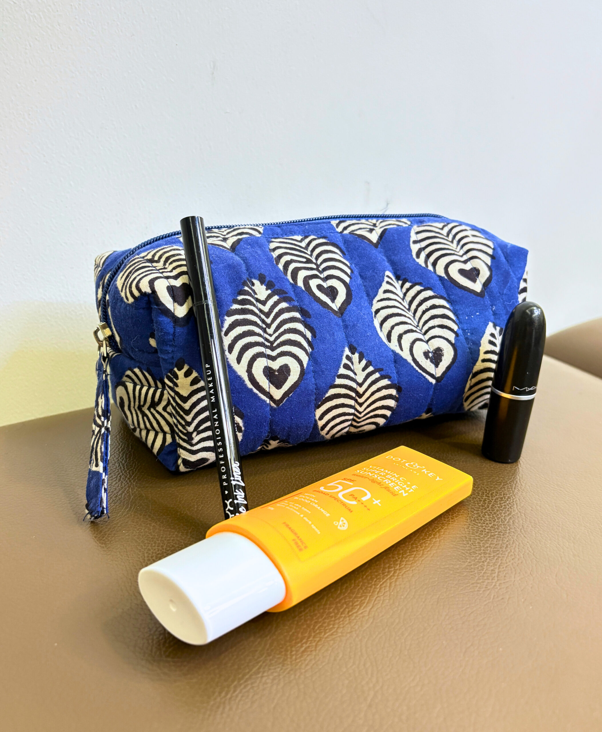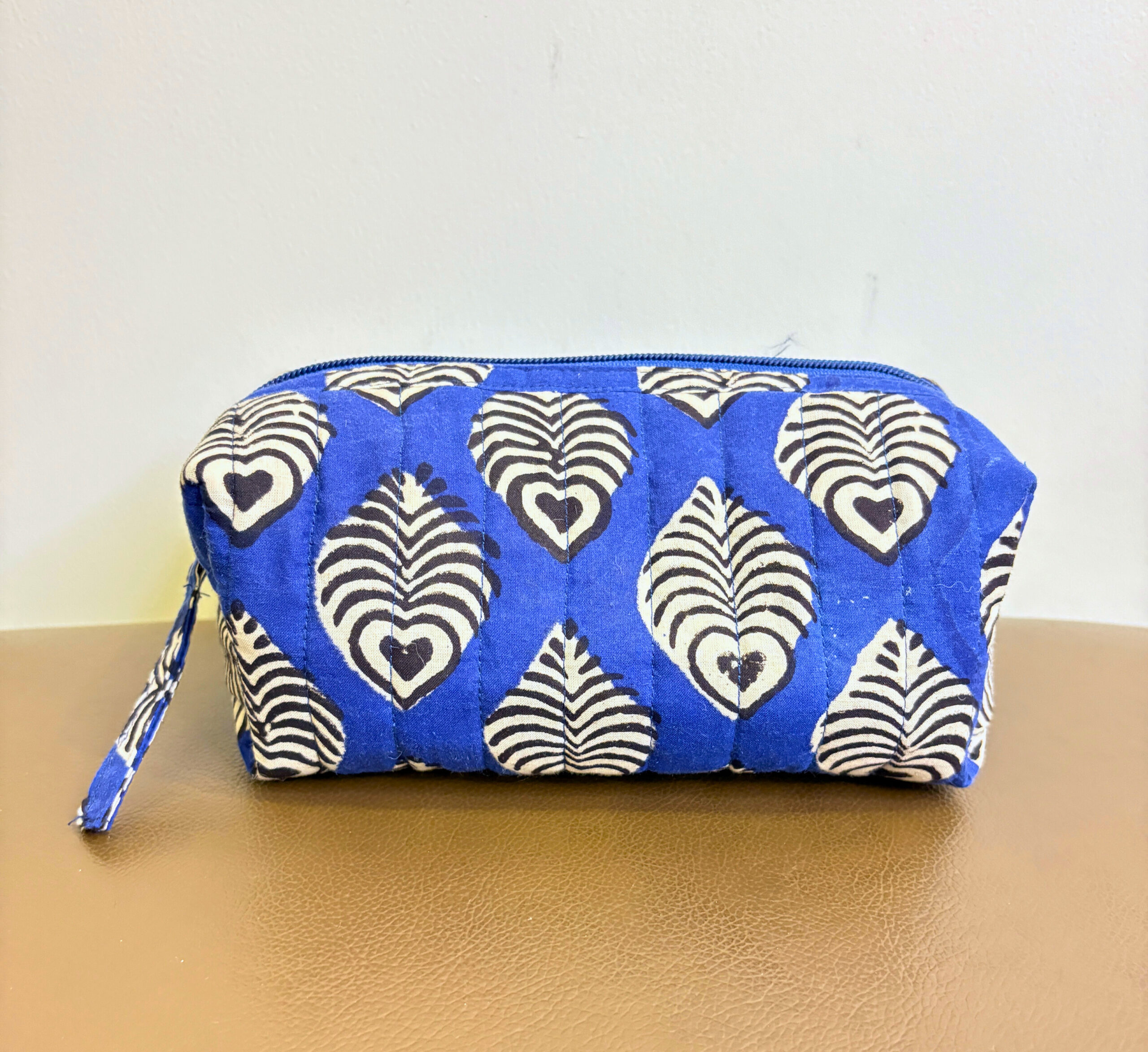 A striking vanity pouch that merges Indian craftsmanship with everyday practicality. The bold indigo base is adorned with ivory block-printed peacock feather motifs, giving it a traditional yet contemporary appeal. Whether you’re travelling or organizing your dresser, this pouch keeps your essentials sorted in style. Thoughtfully quilted and structured for durability.