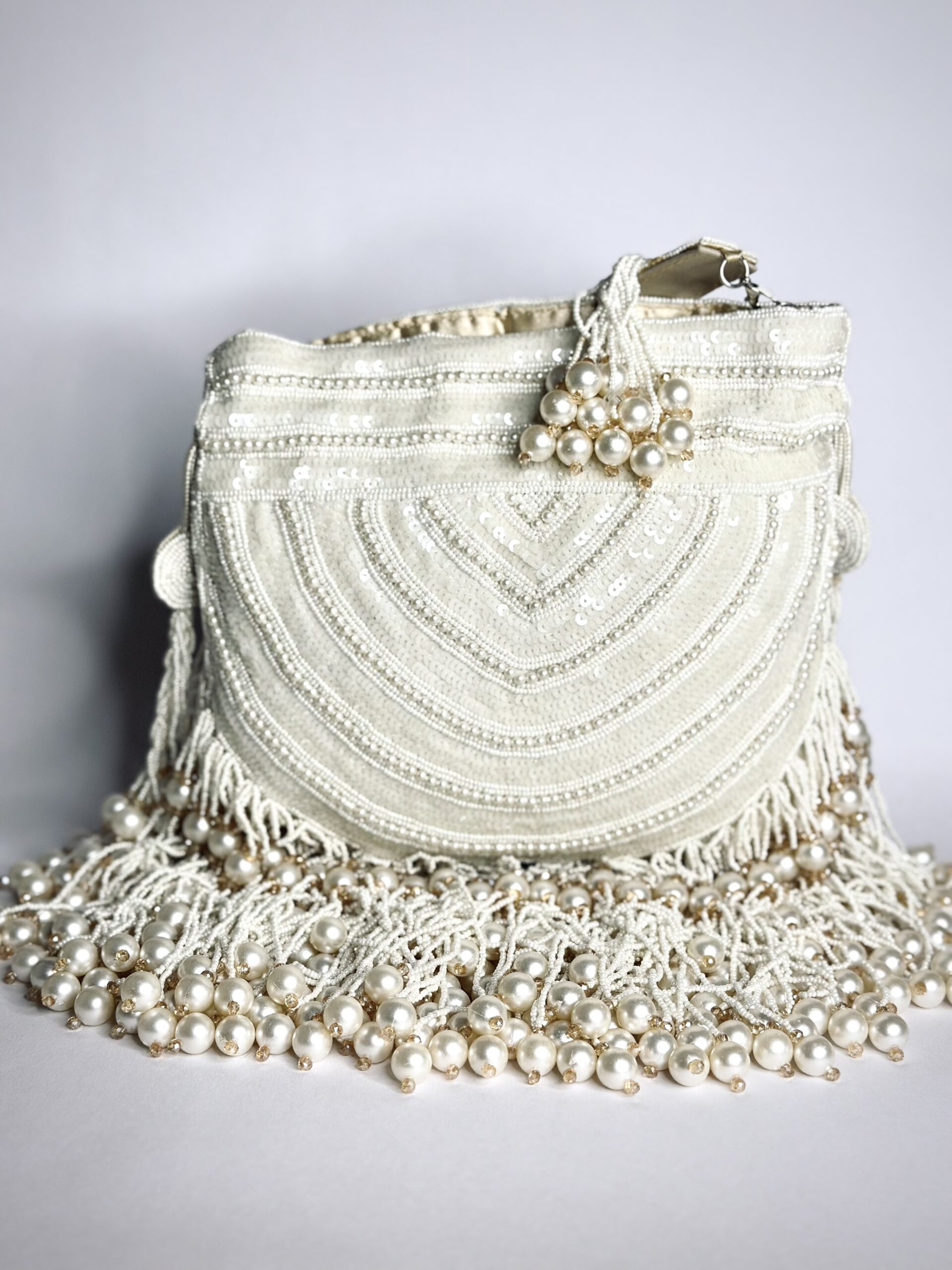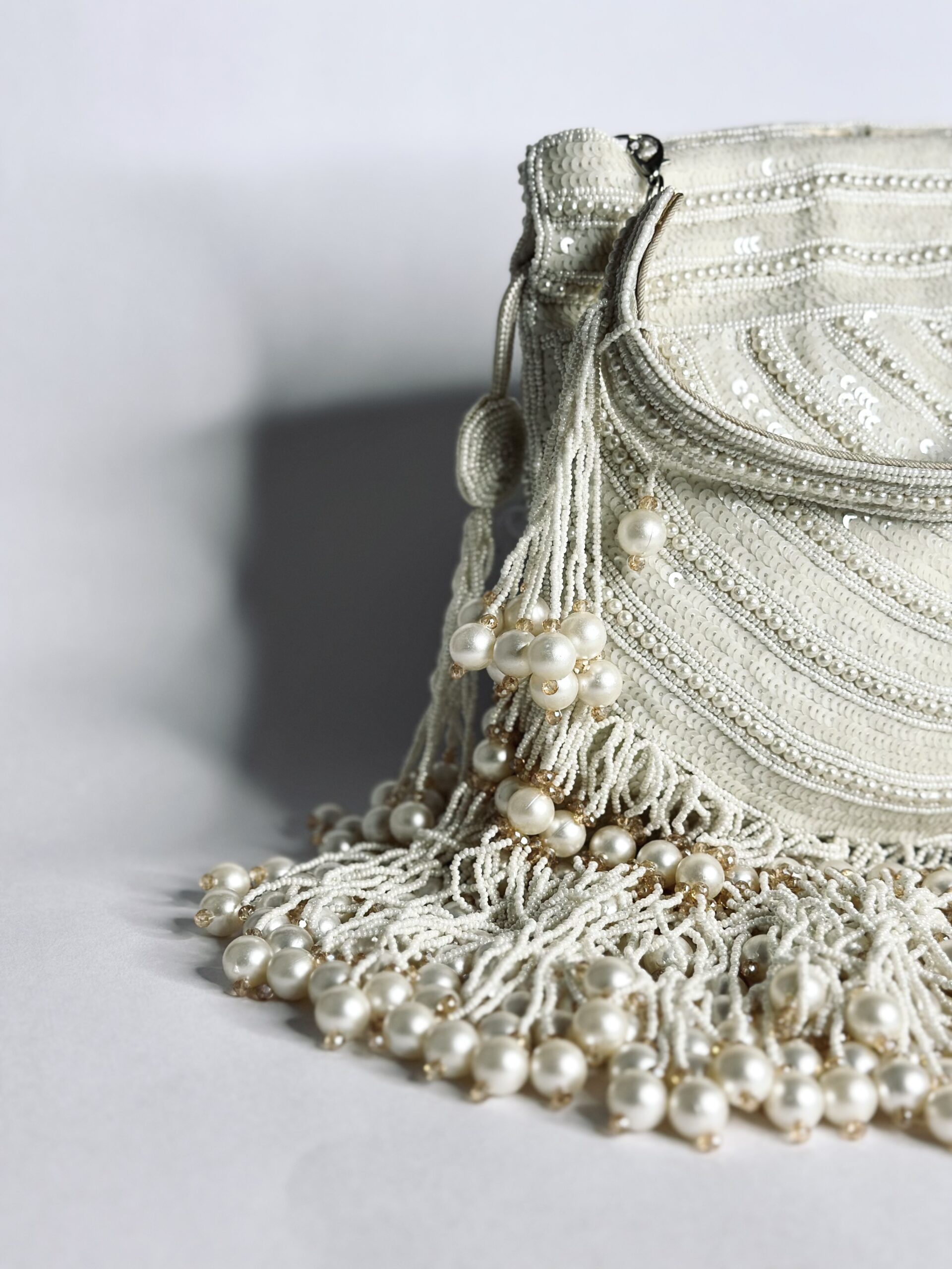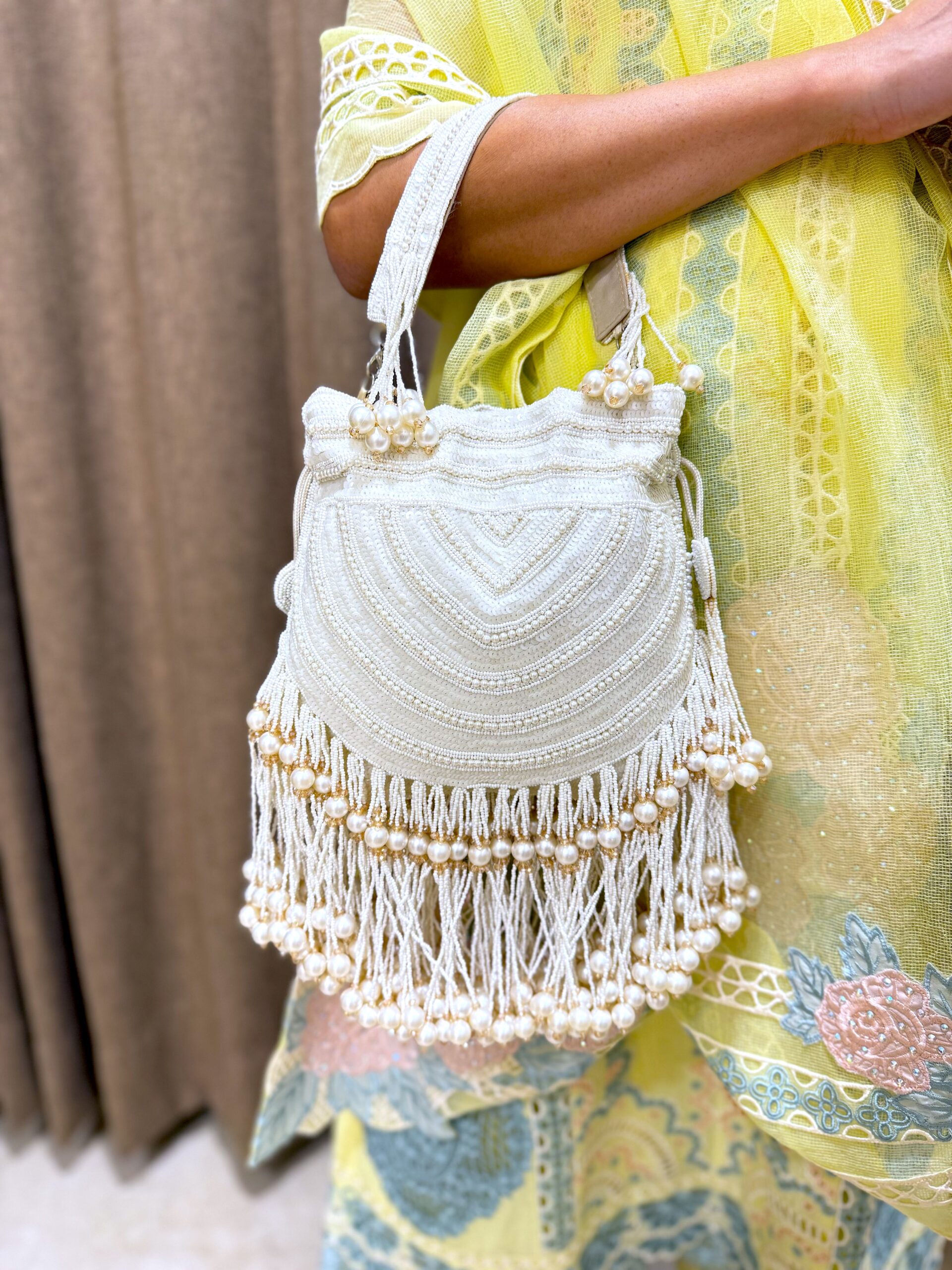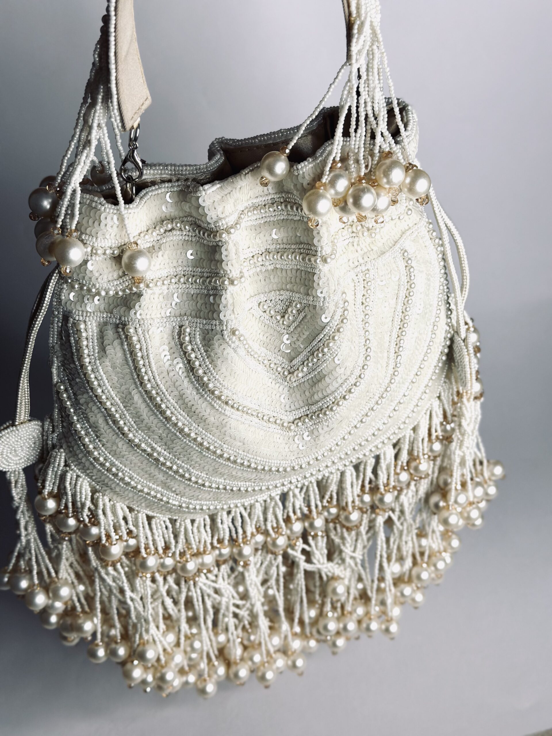 Crafted for the spotlight, this hand-embroidered bag is adorned with faceted glass beads and sequins in luminous white. Long, beaded fringes dance with every step—adding movement, sparkle, and unmistakable glamour to your festive ensemble.