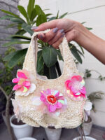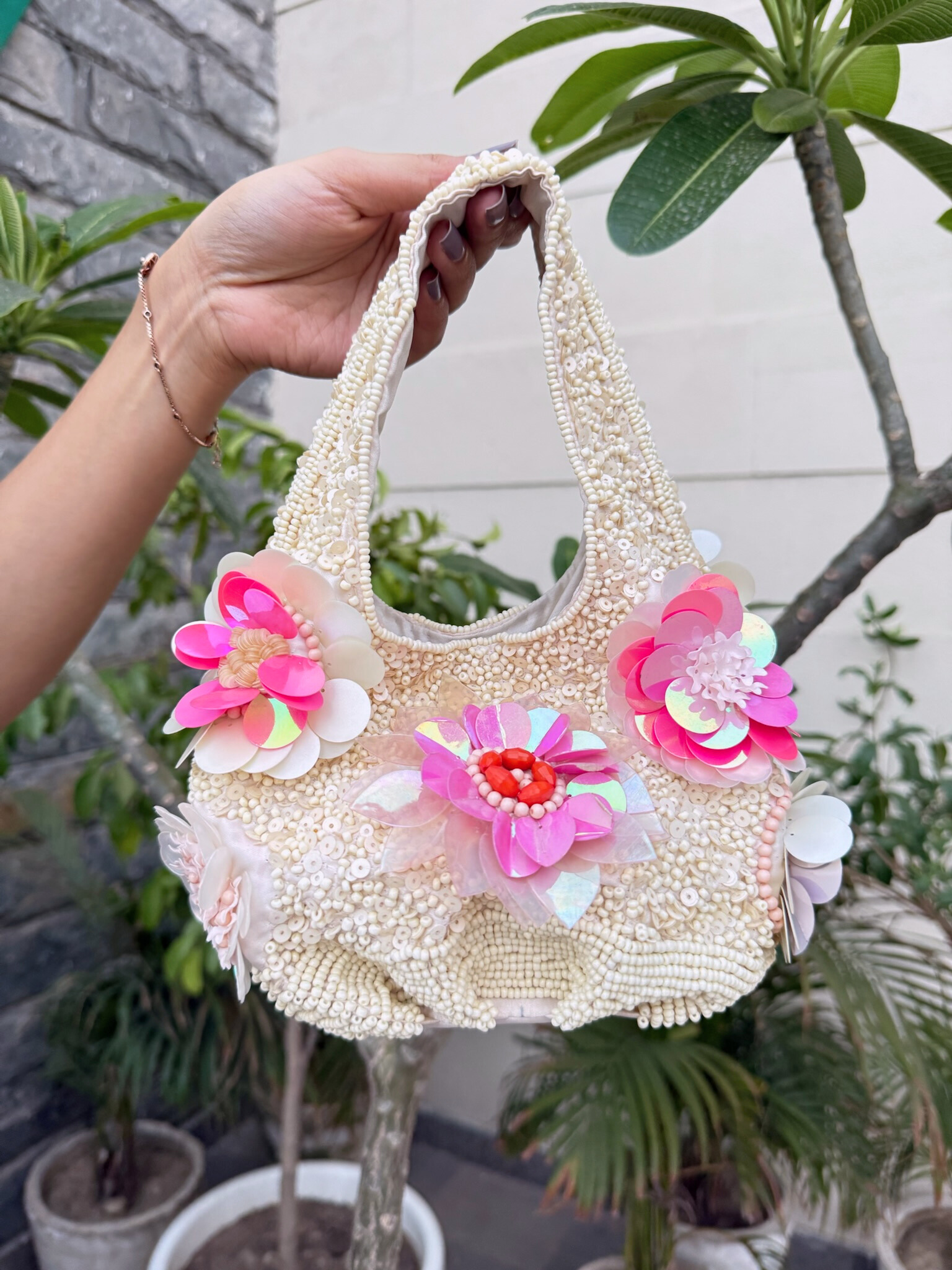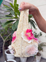 Whimsical, bold, and unapologetically feminine — Pearl Petal is a handcrafted mini bag designed to be the showstopper of any outfit. Adorned with 3D floral appliqués in holographic pinks and ivories, and embellished with sequins and pearls all over the body, it captures the charm of blooming fantasies. Whether styled with a pastel saree or a sundress, this piece adds drama, dazzle, and a dose of joy.