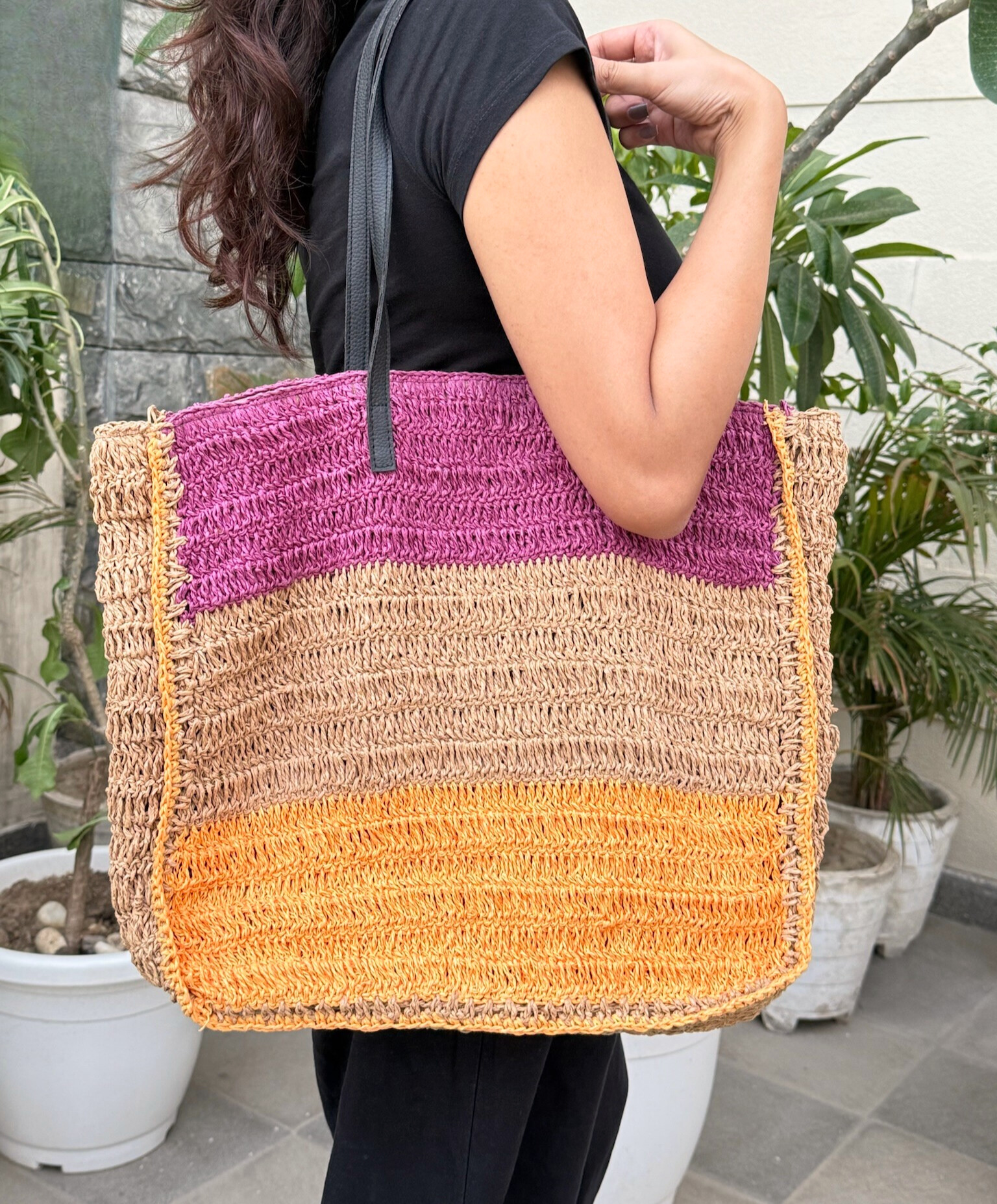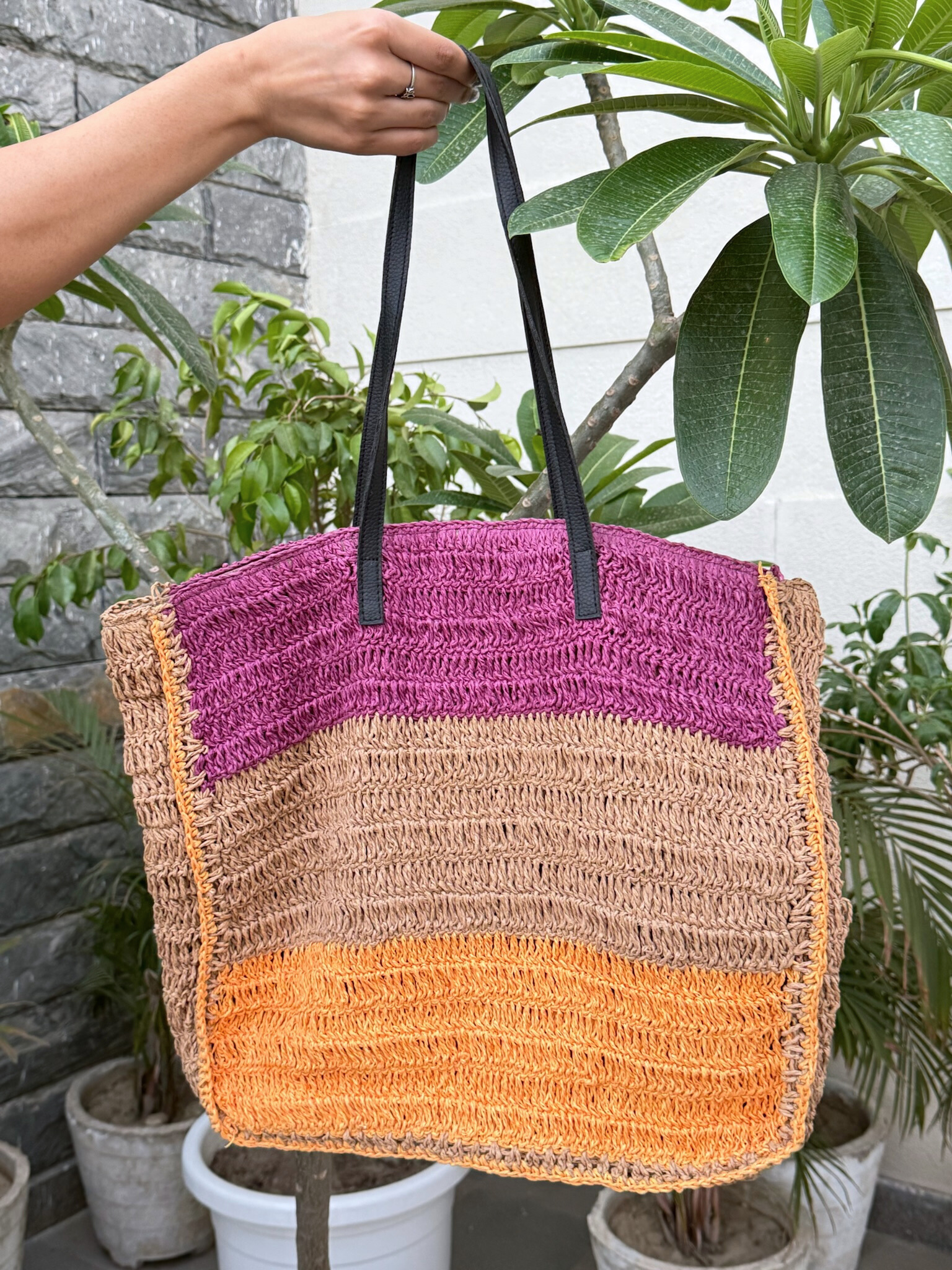 Bright, breezy, and built for sunshine days — Rang Rafia is a handwoven oversized tote that blends bold colour blocks with everyday practicality. Inspired by warm sunsets and slow summer strolls, it’s spacious enough for beach days, farmer’s markets, or weekend escapes. The mix of vibrant plum, grounded beige, and cheerful orange adds a playful edge to this utility-forward beauty.