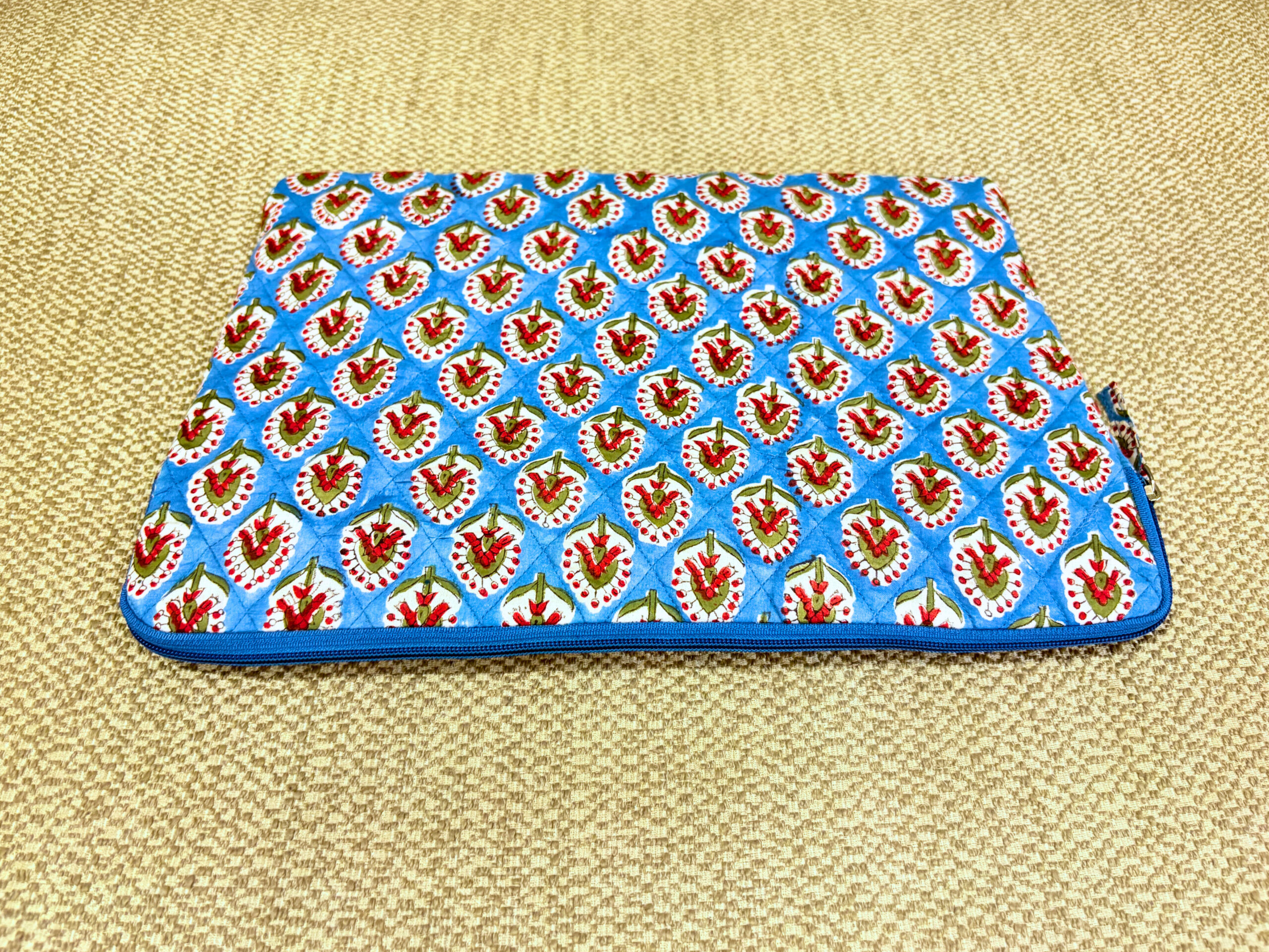 This quilted cotton laptop sleeve features a vibrant floral pattern on a sky blue backdrop, adding a pop of Indian elegance to your tech essentials. Perfect for everyday use, it combines function and flair in a soft silhouette. The artisanal block print brings a handmade charm, while the padded interior keeps your device safe. Whether for work or travel, it’s the stylish way to protect your tech.